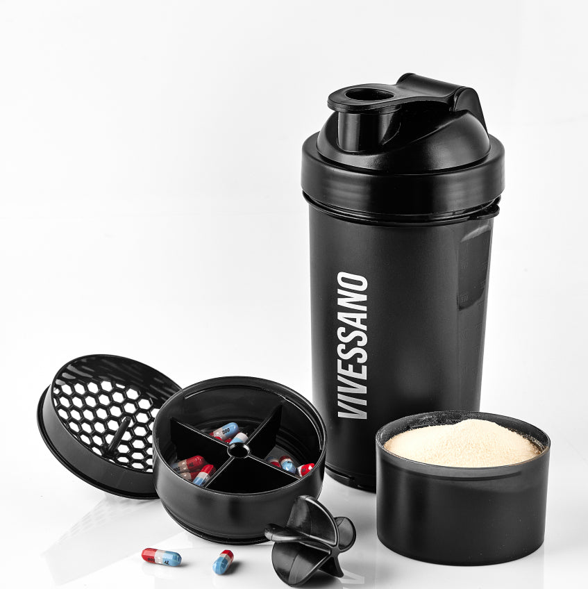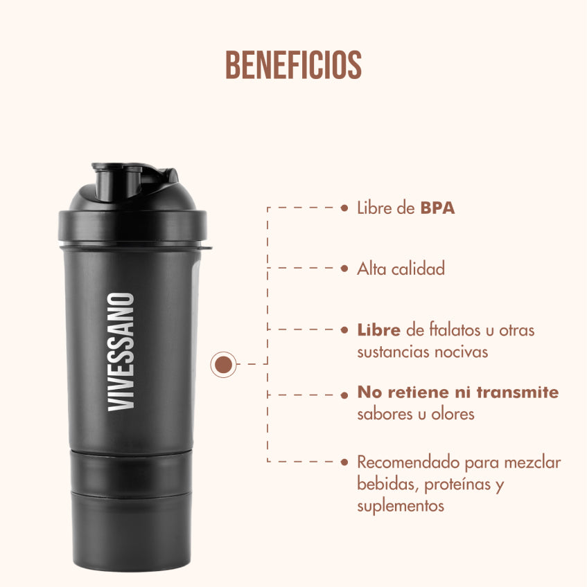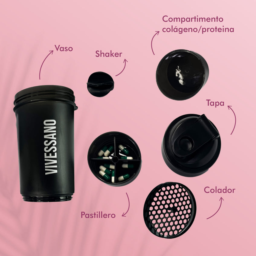 Nuestro termo Shaker de alta calidad es la solución: no transmite olores ni sabores, es ideal para mezclar el colágeno hidrolizado de VIVESSANO, suplementos, bebidas en polvo, entre otros.